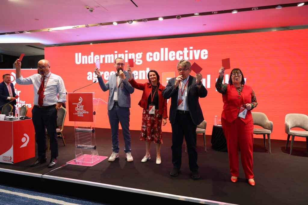 V predvečer finále Európskej ligy sa viac ako 300 odborárov z celej Európy zišlo v Belehrade na strednodobej konferencii Európskej odborovej konfederácie (EOK), aby symbolicky ukázali červenú kartu politike deregulácie a varovali pred oslabením práv pracujúcich.